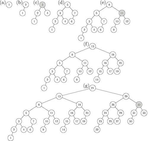 Node insertion is pretty easy. Assuming that the key doesn’t already exist somewhere in the tree, you traverse the tree the same as doing a search and find the lowest node in the tree which is closest to the key you’re inserting. For example,